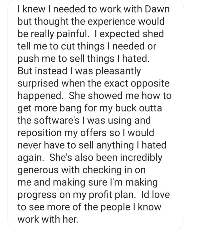 “Dawn understood my business and my buyers in an extremely short amount of time. Working with her I created and sold an offer in one week that created instant profit for my business.”